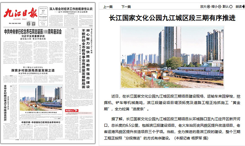編者按:長(zhǎng)江國家文化公園(九江城區(qū)段)三期項(xiàng)目開工建設(shè)以來,備受各界關(guān)注,“九江發(fā)布”“九江廣播電視臺(tái)”公眾號(hào)、“掌中九江”APP等主流媒體持續(xù)報(bào)道。12月17日《九江日?qǐng)?bào)》頭版報(bào)道工程建設(shè)推進(jìn)情況,現(xiàn)轉(zhuǎn)載如下: