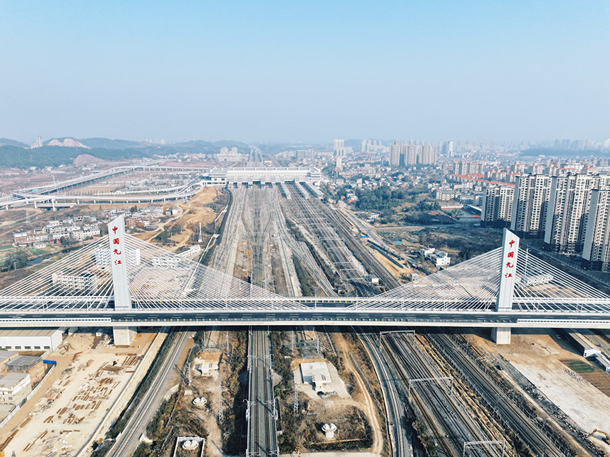 該工程橫跨福銀高速、京九鐵路等重要路線,安全施工要求非常高。面對(duì)復(fù)雜的施工條件,市城發(fā)集團(tuán)始終堅(jiān)守百年大計(jì)、質(zhì)量為先的理念,成立項(xiàng)目專班,采取多項(xiàng)措施確保主體工程質(zhì)量,不僅保障了項(xiàng)目建設(shè)順利推進(jìn),而且創(chuàng)造了多項(xiàng)國(guó)際、國(guó)內(nèi)紀(jì)錄。其中跨廬山站立交工程主橋?yàn)槭澜缟献畲髧嵨环菍?duì)稱轉(zhuǎn)體曲線斜拉橋,跨昌九快速路斜拉橋是目前國(guó)內(nèi)轉(zhuǎn)彎半徑最小的矮塔斜拉橋。